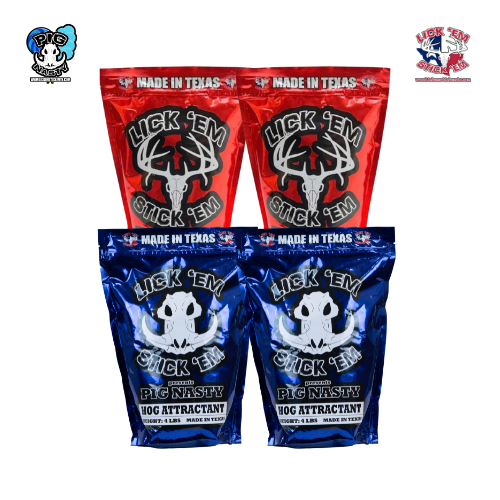 This powerful four bag bundle combines two of the most trusted wildlife attractants on the market. You will receive two bags of Lick Em Stick Em Deer Attractant and two bags of Pig Nasty Hog Attractant, giving you a complete solution for both deer management and hog control on your property. Each product is field tested, long lasting, and designed to bring animals in fast and keep them coming back.